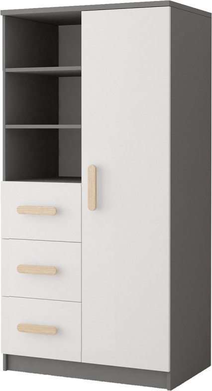 Uspořádánípo levé straně otevřené poličky a tři zásuvkypo pravé straně za dvířky police