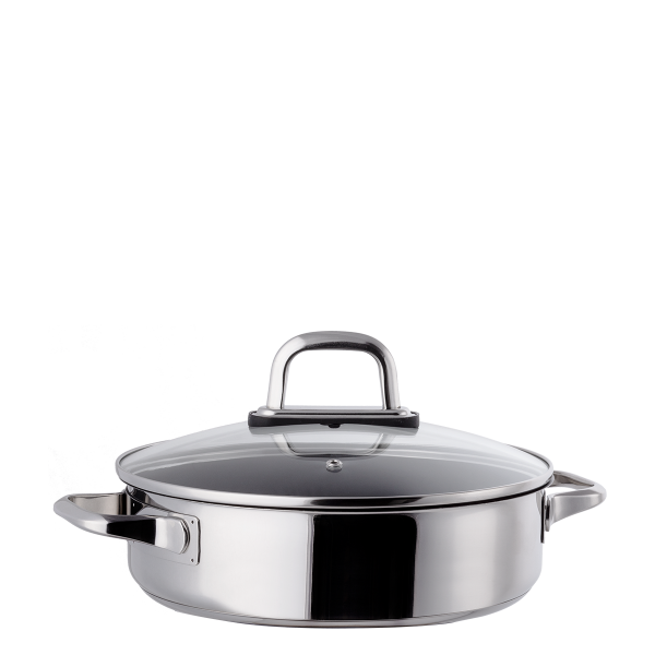 Zapékací pánev Saturn s velkorysým průměrem až 26 cm vyniká zejména díky unikátní technologii vnitřní povrchové úpravy. Jedná se o ILAG XERADUR 2 s metalickým efektem, který je vysoce odolný vůči oděrům a korozi. Test přilnavosti dokázal, že vajíčka se nepřipálila ani při teplotě 300 °C, což ocení začínající kuchařky i zkušení mistři. Série Saturn je navržena v nadčasovém designu s velkými praktickými držadly, vhodná na všechny typy varných desek, vyrobená z kvalitních materiálů, které obstojí i při častém používání a mytí. Lze ji vkládat do trouby při teplotě max. 220 °C a také do myčky nádobí. Součástí je i poklice ze skla s parním ventilem a velkou úchytkou se silikonovým těsněním. Pro riziko proniknutí vody doporučujeme poklici mýt manuálně. .=